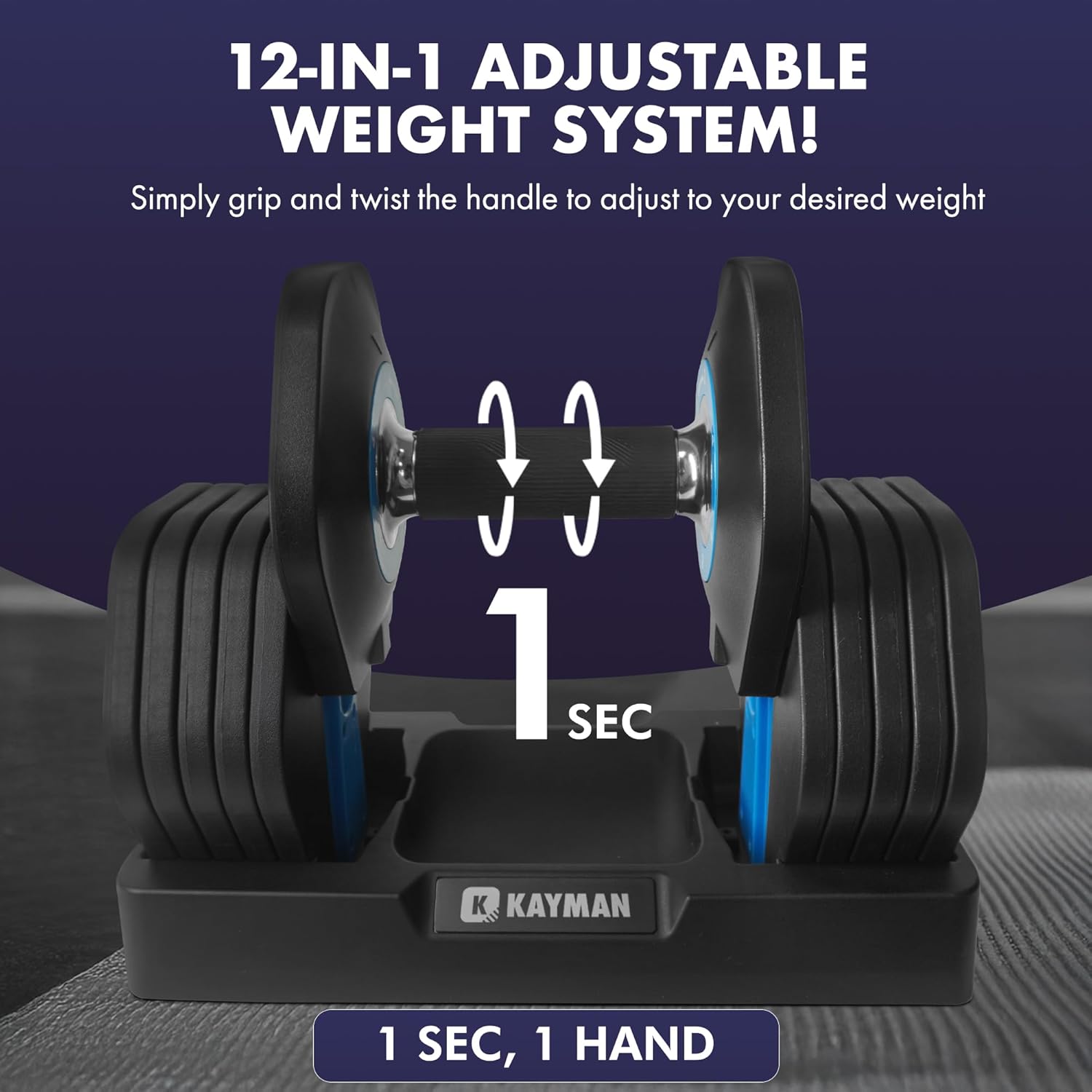 ADJUSTABLE WEIGHTS FOR FLEXIBLE WORKOUTS: Customize your training with adjustable dumbbell weights from 2kg to 12kg per dumbbell, supporting a wide range of exercises. With a combined total weight of 24kg, this set is ideal for strength building, toning, and full-body workouts.