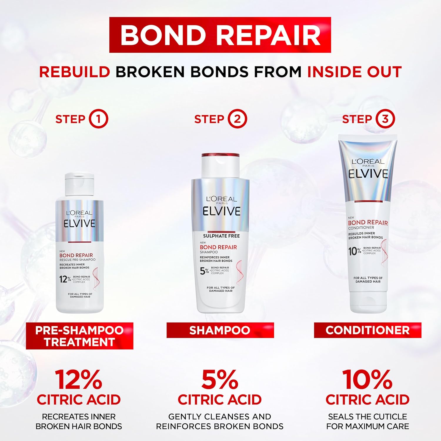 Discover the New Elvive Bond Repair Shampoo by L’Oréal Paris, a groundbreaking addition to your haircare regimen. This innovative, Sulphate free shampoo¹ thoughtfully forms the crucial second step of our advanced Bond Repair haircare routine, specifically designed to tackle visible damage. Your hair’s inherent beauty and resilience stem from millions of intricate bonds that provide its essential structure and strength. However, daily aggressors like rigorous brushing, chemical treatments such as bleaching, intense heat styling, and environmental exposure relentlessly attack these vital bonds, causing them to break down and leaving hair weak, brittle, and undeniably damaged. For the very first time, L’Oréal Paris introduces a breakthrough formula powered by our unique Citric Acid Complex. This advanced complex specifically targets and works to repair these compromised hair bonds from within. Experience a profound transformation as hair is effectively restored to its original strength², revealing exceptional vitality. Witness remarkable results including up to 98% less breakage, 90% more shine & 82% stronger hair³. This potent shampoo is perfectly suitable for all types of damaged hair, providing a comprehensive solution for healthier, more resilient strands.