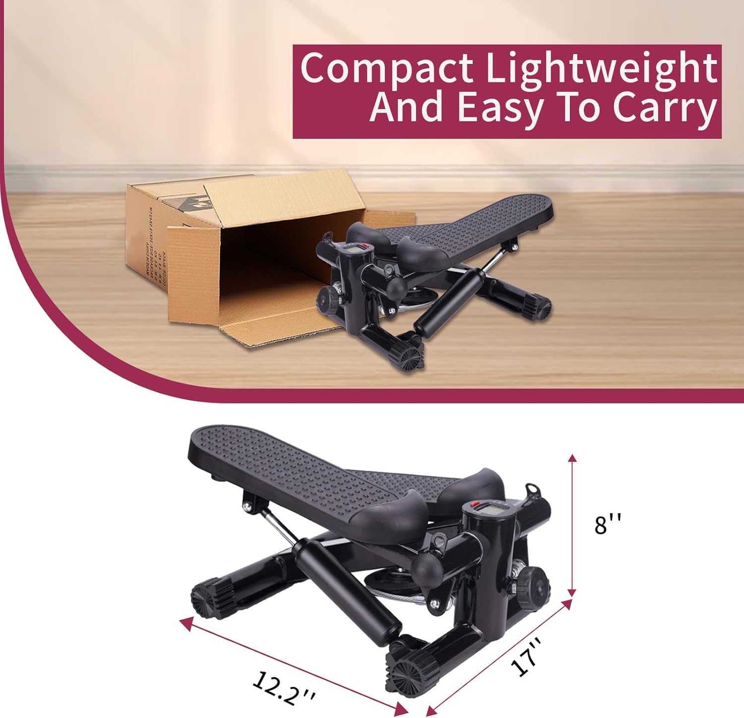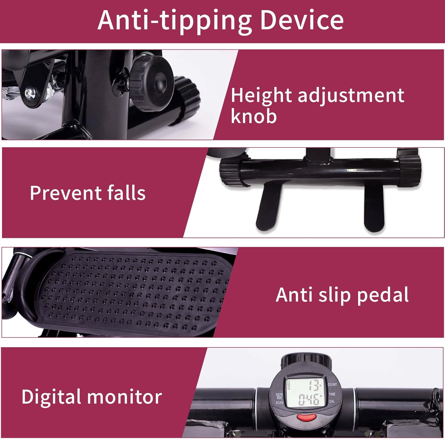 【Special features】This stepper has a protective anti-tipping device, which should be opened to 90° perpendicular to the base frame during usage.The unique anti rollover design makes your sports safer and more reassuring.