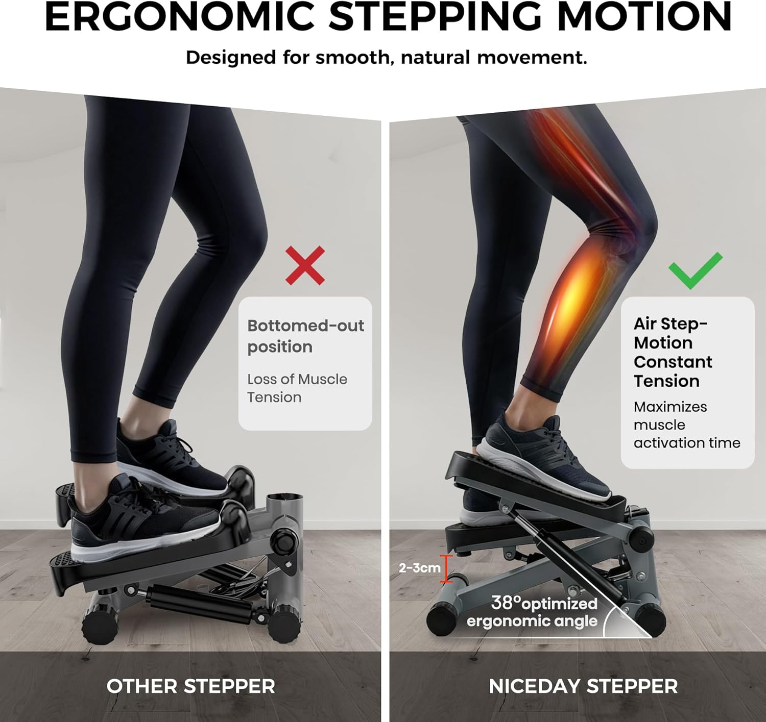 【Durable and Safe】Hydraulic cylinders and oversized, non-slip tread pedal provide the smooth and perfect experience during exercise. Niceday mini stepper is the EN 957 certified fitness device, which gives you a safe exercising experience.