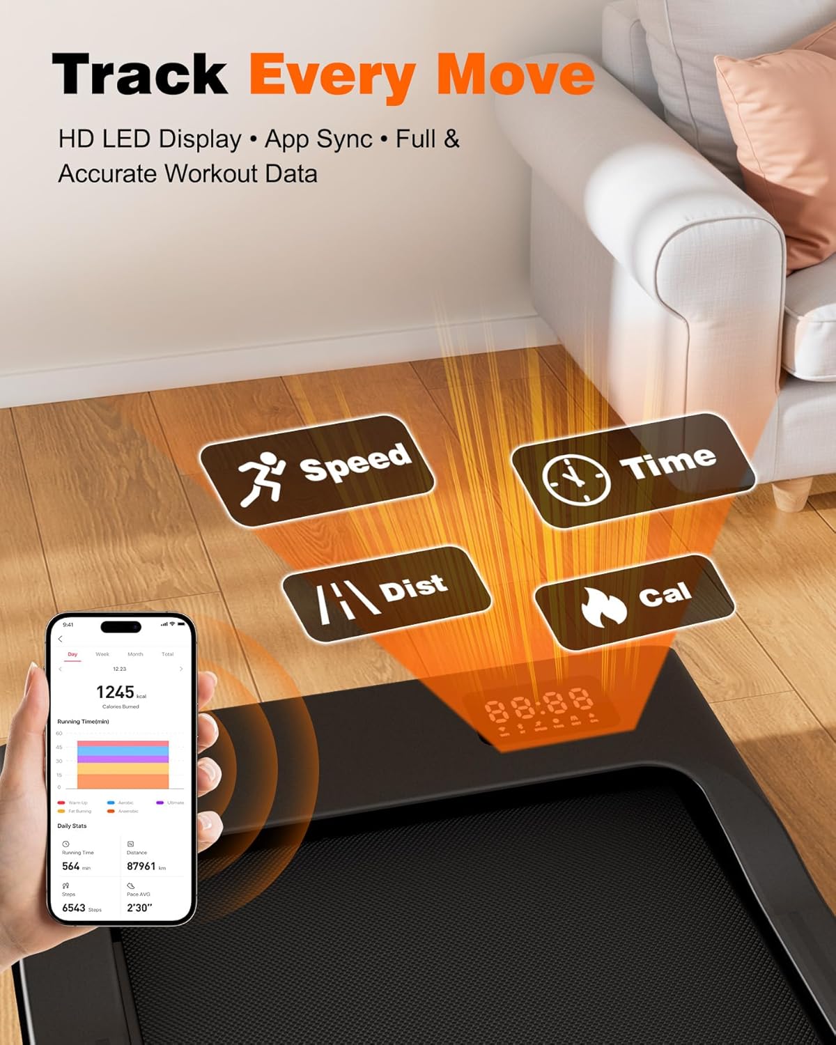 Professional Courses & Real-time Monitor: Superun walk pad can be connected with app. The application can provide AI training and profeesional guidance to help you achieve your fitness goal. Scientific plans are provided and users can be in the right path to get fitness.